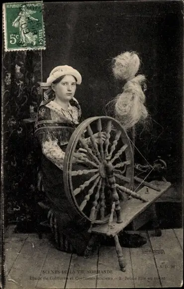 Ak Normandie, Mädchen in Tracht beim Spinnen, Spinnrad