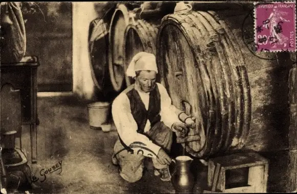 Ak Normandie, Mann in Tracht zapft aus einem Fass