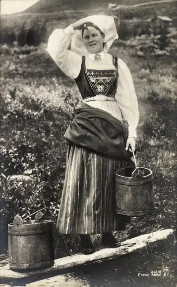Ak Norwegen, Frau in Volkstracht, Holzeimer