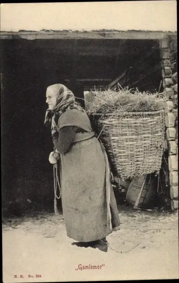 Ak Norwegen, Gamlemor, Alte Norwegerin, Kiepe voller Stroh
