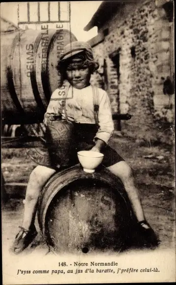 Ak Notre Normandie, Junge sitzt auf einem Weinfass