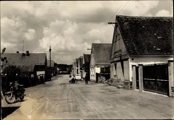 Ak Nový Dům u Rakovnika Neuhaus Mittelböhmen, Straßenpartie, Häuser, Motorrad