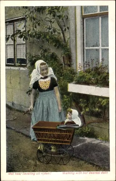 Ak Nuederlande, Mädchen in Tracht mit Puppe und Puppenwagen