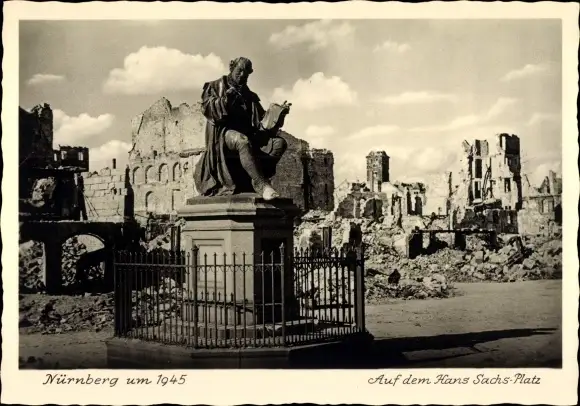 Ak Nürnberg in Mittelfranken, Auf dem Hans Sachs Platz, zerstörte Häuser, Denkmal