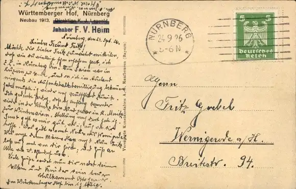 Zustand, siehe Scan, gelaufen, 1926- Inhaber: F.V. Heim - ca 14 cm X 9 cm