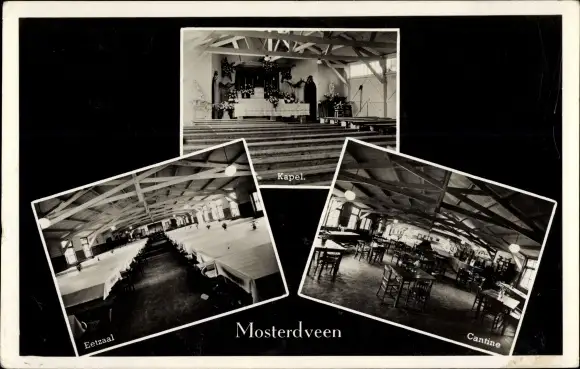 Ak Nunspeet Gelderland, R.K. Vac. Centr. Mosterdveen, Kapel, Eetzaal, Cantine