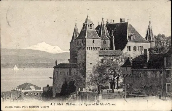 Ak Nyon Kt. Waadt Schweiz, Schloss und Mont Blanc