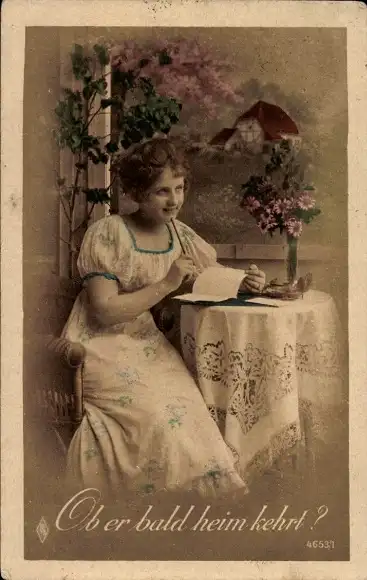 Ak Ob er bald heimkehrt, Frau denkt an seinen Geliebten