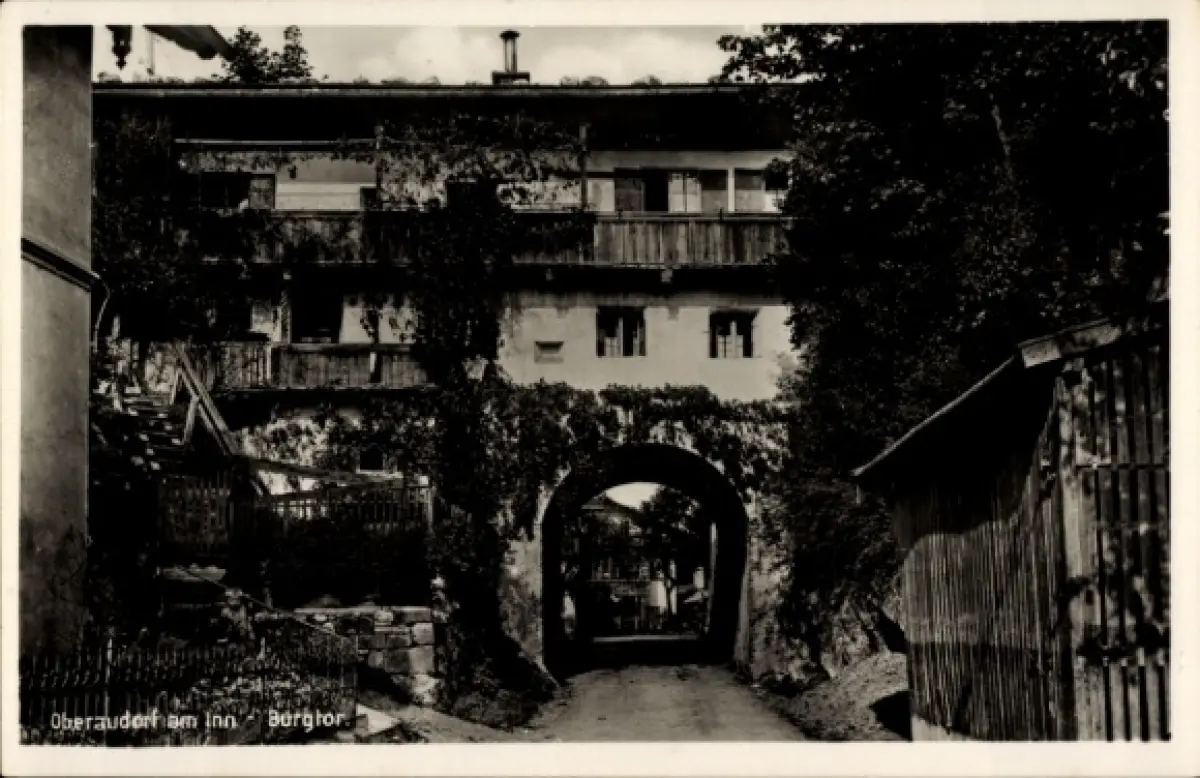 Ak Oberaudorf am Inn Oberbayern, Burgtor, Gebäude mit Torbogen, Schwarz-Weiß-Fotografie
