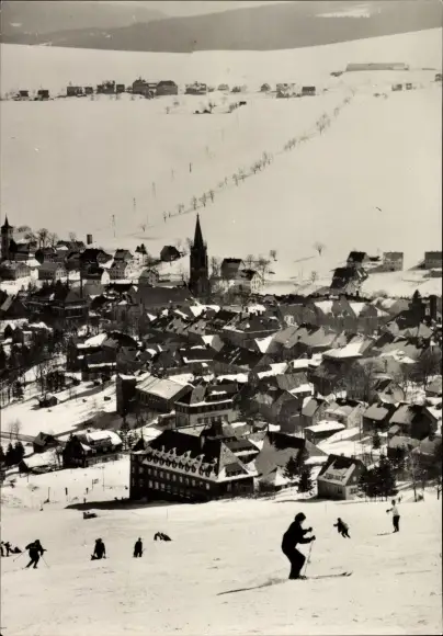 Ak Oberwiesenthal im Erzgebirge, Panorama, Winter, Skifahrer