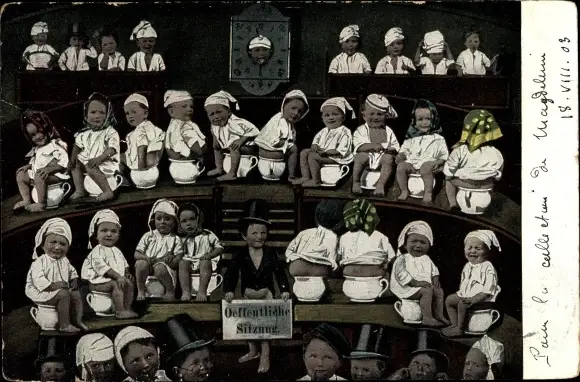 Ak Öffentliche Sitzung, kleine Kinder, Nachttöpfe, Fotomontage