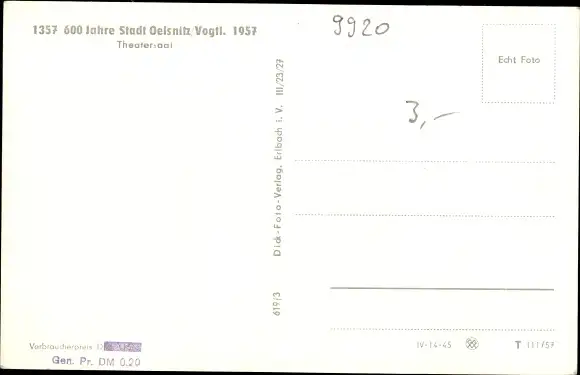 Ak Oelsnitz im Vogtland, Theatersaal, 600 Jahre der Stadt