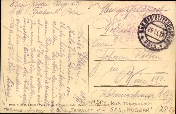Zustand, siehe Scan, gelaufen, 1917- MSP SMS Trabant - ca 14 cm X 9 cm