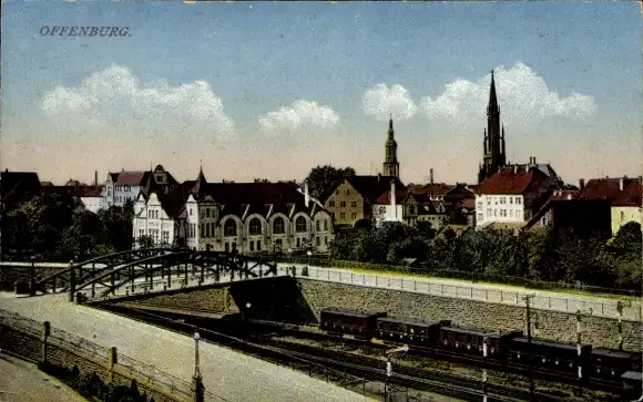 Ak Offenburg in Baden Schwarzwald, Teilansicht, Brücke, Kirche, Eisenbahn