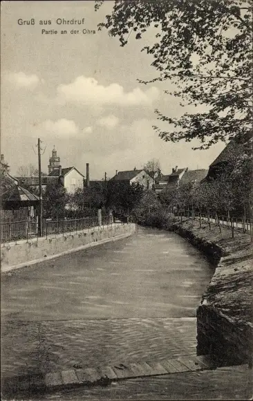 Ak Ohrdruf im Thüringischen Kreis Gotha, Partie an der Ohra, Kirchturm