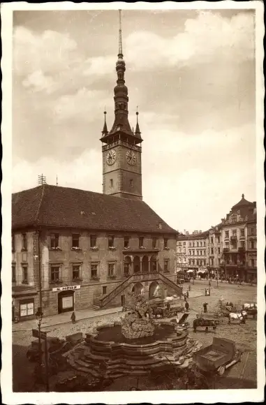 Ak Olomouc Olmütz Stadt, Platz, Gebäude mit Uhrenturm, Brunnen