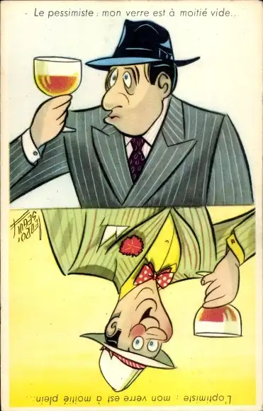 Ak Optimist und Pessimist, Glas halb voll, leer