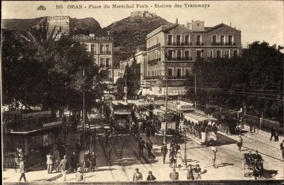Ak Oran Algerien, Place du Marechal Foch, Station des Tramways, Straßenbahn