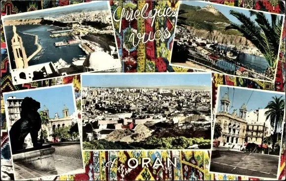 Ak Oran Algerien, Quelques vues, Löwenstatue, Ortsansicht, Hafen, Panorama