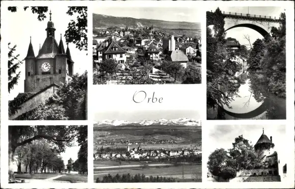 Ak Orbe Kanton Waadt Schweiz, Kirche, Panorama, Brücke, Ortsansicht, Park