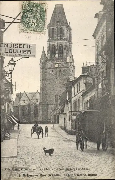 Ak Orbec Calvados, Rue Grande, Eglise Notre Dame
