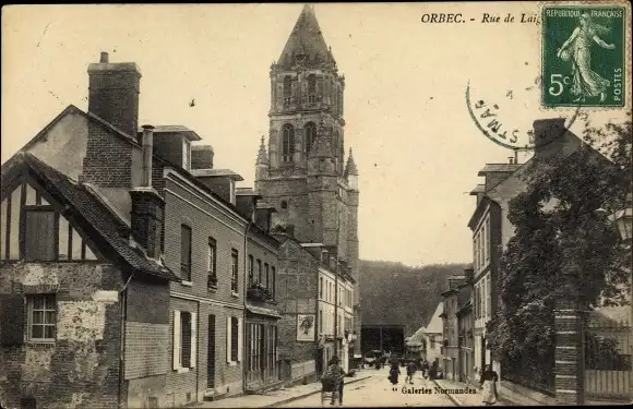 Ak Orbec Calvados,Straßenpartie, Kirchturm
