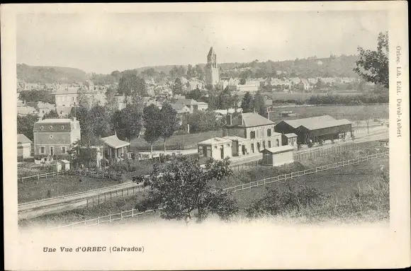 Ak Orbec Calvados, Une Vue, Blick auf den Ort, Bahnhof
