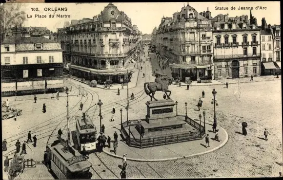 Ak Orléans Loiret, La Place du Martroi, Statue de Jeanne d'Arc, Straßenbahn