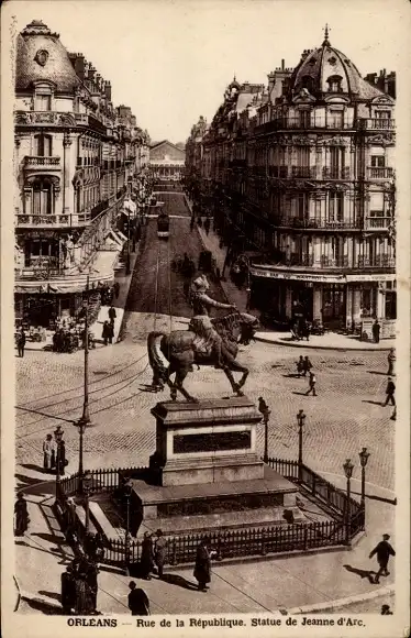 Ak Orléans Loiret, Rue de la Republique, Statue de Jeanne d'Arc, Straßenbahn