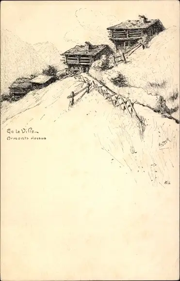 Ak Ormont-Dessus Kanton Waadt Schweiz, Ansicht Holzhäuser, Dorf, Pfad am Hang