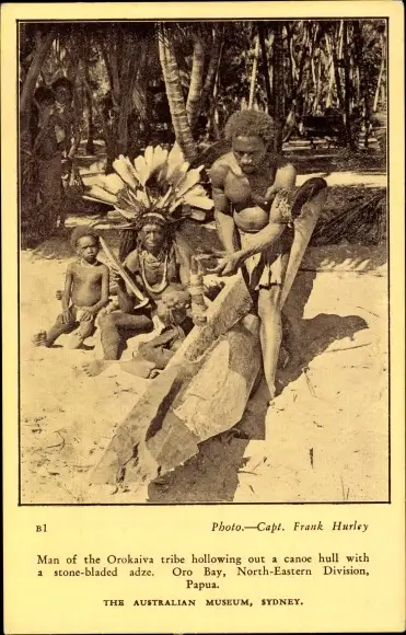 Ak Oro Bay Papua Neuguinea, Man of the Orokaiva tribe hollowing out a canoe hull