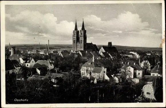Ak Oschatz in Nordsachsen, Blick über die Dächer der Stadt, Kirche