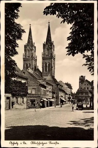 Ak Oschatz in Sachen, Altoschatzer Straße, Geschäfte, Modenhaus Schmidt, Kirche
