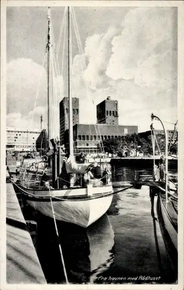 Ak Oslo Norwegen, Hafen mit Rathaus
