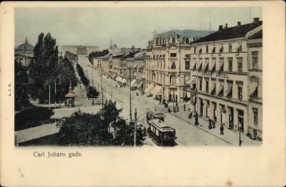 Ak Oslo Norwegen, Karl Johans gate, Straßenbahn, Grand Hotel