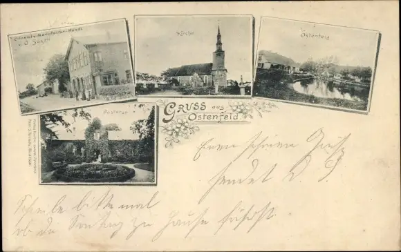 Ak Ostenfeld Husum in Nordfriesland, Kirche, Pastorat, Kolonialwaren Saxen