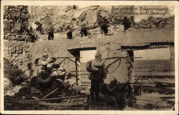 Ak Ostpreußischer Kriegsschauplatz, Eine Patrouille sucht Deckung, I. WK