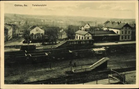 Ak Ostrau in Sachsen, Totalansicht mit Bahnhof, Gleisseite