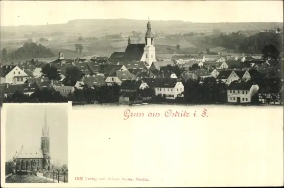 Ak Ostritz in der Oberlausitz, Kirchen, Stadtpanorama