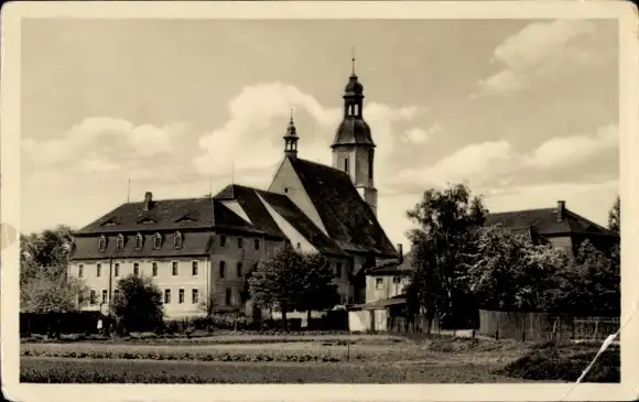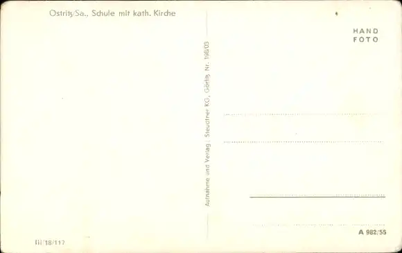 Ak Ostritz in der Oberlausitz, Schule mit kath. Kirche