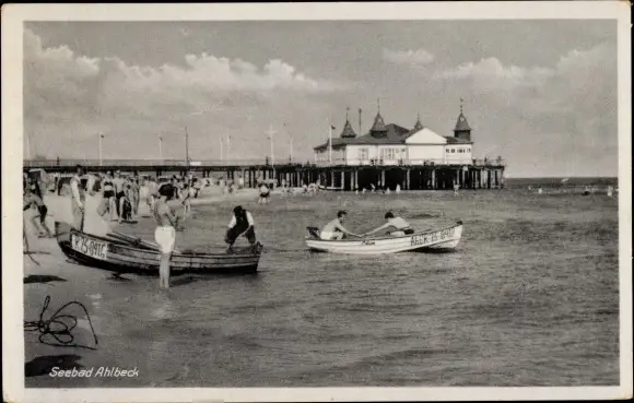 Ak Ostseebad Ahlbeck Heringsdorf auf Usedom, Seebrücke, Boote, Strand