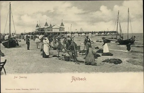 Ak Ostseebad Ahlbeck Heringsdorf auf Usedom, Seesteg, Strand, Boote, Frauen, Männer
