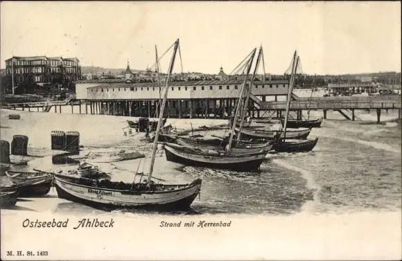 Ak Ostseebad Ahlbeck Heringsdorf auf Usedom, Strand mit Herrenbad, Boote