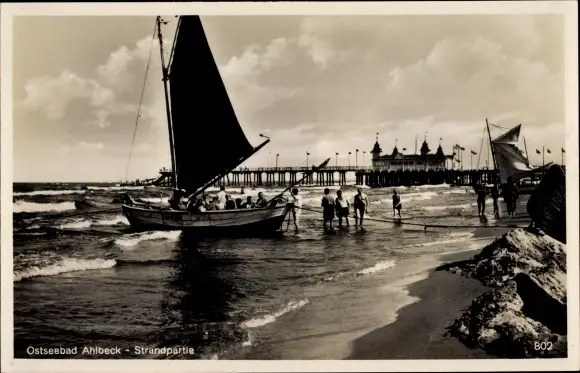 Ak Ostseebad Ahlbeck Heringsdorf auf Usedom, Strandpartie, Seebrücke, Segelboot