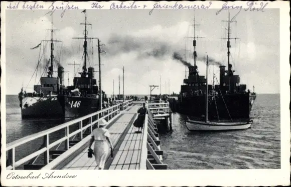 Ak Ostseebad Arendsee Kühlungsborn, Seebrücke, Dampfer, Kriegsschiffe