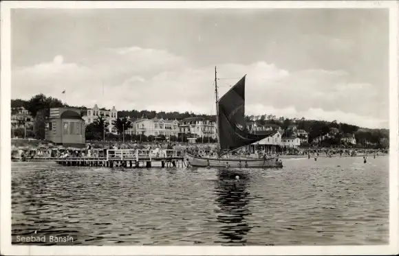 Ak Ostseebad Bansin auf Usedom, Teilansicht, Segelboot