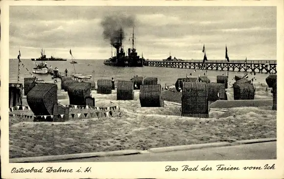 Ak Ostseebad Dahme in Holstein, Strand, Anlegeplatz, Schiffe
