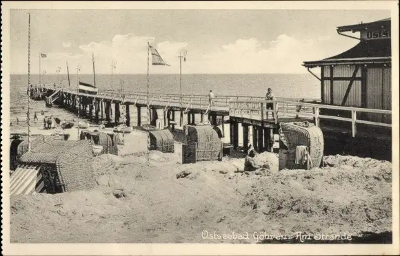 Ak Ostseebad Göhren auf Rügen, Am Stande, Steg, Strandkörbe, Fahnen