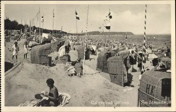 Ak Ostseebad Göhren auf Rügen, Am Strande, Badegäste, Strandkörbe, Fahnen