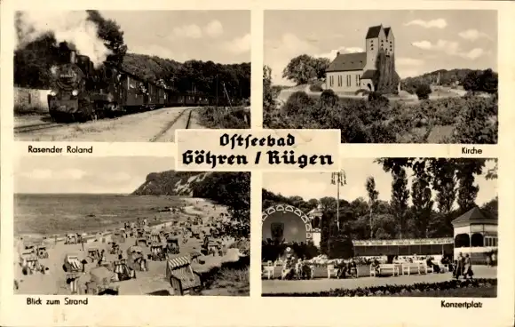 Ak Ostseebad Göhren auf Rügen, Rasender Roland, Kirche, Strand, Konzertplatz